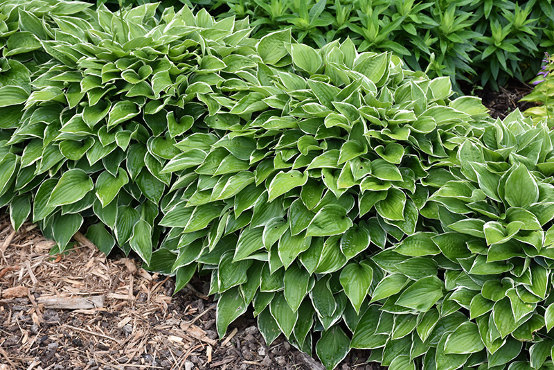 Attractive mounds of oval shaped dark green leaves, variegated with a narrow white margin; soft lavender flowers emerge in mid-summer; provides beautiful texture and contrast to the garden and border
