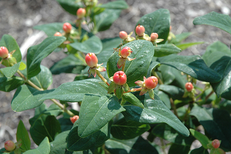 Hypearls Olivia St. John's Wort has masses of beautiful yellow buttercup flowers at the ends of the branches from late spring to mid summer, which are most effective when planted in groupings. The flowers are excellent for cutting. It features an abundance of magnificent salmon berries from late summer to mid fall. It has green deciduous foliage. The narrow leaves do not develop any appreciable fall colour.