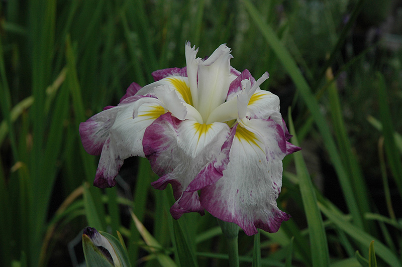 Freckled Geisha Japanese Flag Iris features showy double white flag-like flowers with violet overtones, chartreuse throats and violet edges at the ends of the stems in mid summer. The flowers are excellent for cutting. Its attractive sword-like leaves remain green in colour throughout the season.