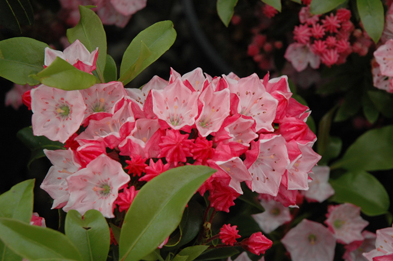 Carol Mountain Laurel features showy clusters of shell pink cup-shaped flowers with white centers at the ends of the branches from mid to late spring, which emerge from distinctive pink flower buds. It has attractive dark green evergreen foliage which emerges deep purple in spring. The glossy pointy leaves are highly ornamental and remain dark green throughout the winter.