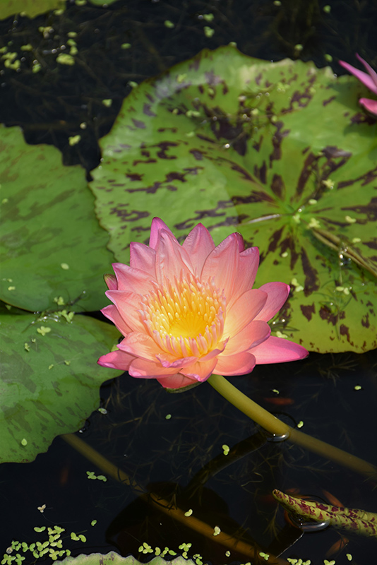 Tropical water lily with apricot pink star-shaped flowers from summer to winter; round mottled foliage is huge; easy to care for; water lilies dislike moving water; annual in colder climates