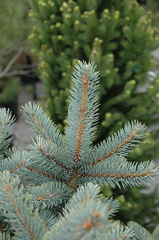 Bakeri Blue Spruce is primarily valued in the landscape for its distinctively pyramidal habit of growth. It has attractive silvery blue evergreen foliage. The needles are highly ornamental and remain silvery blue throughout the winter. The rough gray bark adds an interesting dimension to the landscape.