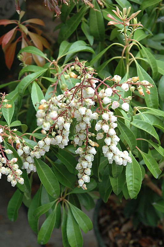 A highly ornamental broadleaf evergreen shrub, prized for its delicate and showy chains of small white bell-shaped flowers; foliage is bronze to red when young; a dense and compact variety; performs best in moist, organic and acidic soils