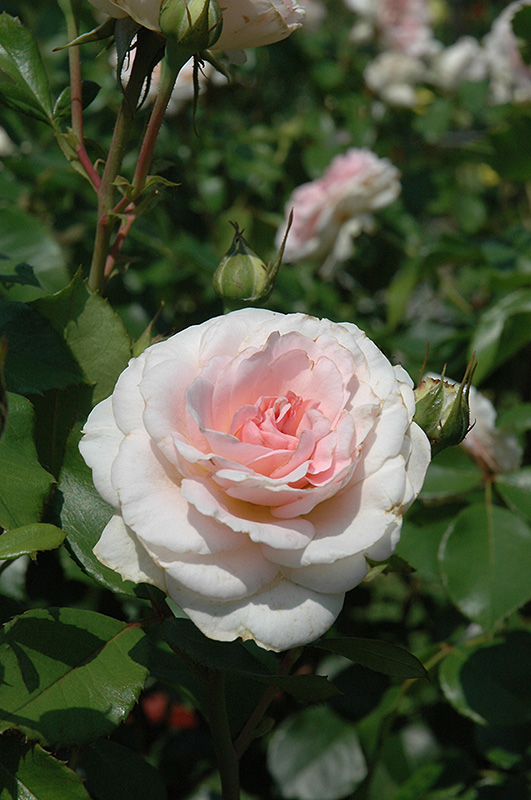 Bushy and upright in form, this variety produces creamy, soft pink blooms that are full and robust, creating tremendous visual impact when massed in the garden; blooms repeat all season long and make splendid cut flowers