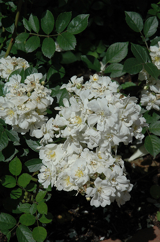 Volumes of striking white blooms with golden centers; creates great contrast in small spaces and containers; excellent disease resistance; benefits from winter protection