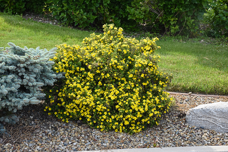 Dakota Goldrush Potentilla will grow to be about 3 feet tall at maturity, with a spread of 4 feet. It tends to fill out right to the ground and therefore doesn't necessarily require facer plants in front. It grows at a slow rate, and under ideal conditions can be expected to live for approximately 30 years.