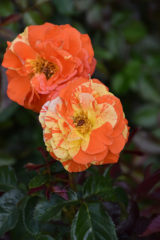 A distinct variety producing flushes of stunning orange blooms with pure yellow stripes, on tall arching canes; habit is very upright with emerging deep red foliage maturing to dark green; all roses need full sun and well-drained soil