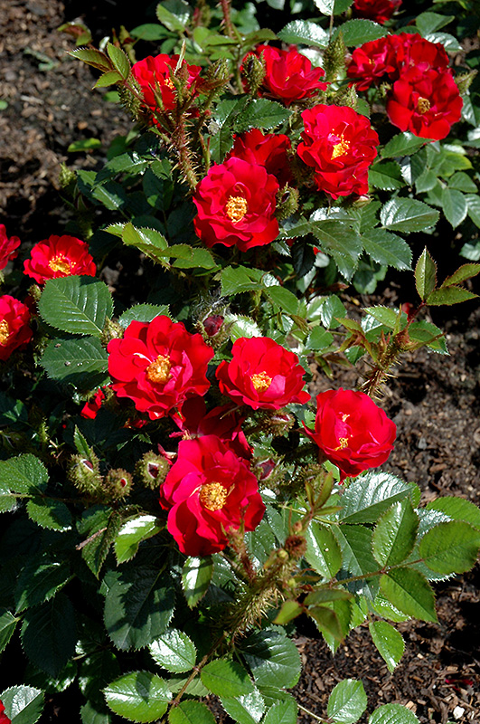 Volumes of stunning scarlet red double blooms, with golden centers; creates great interest in small spaces, as groundcover and in containers; excellent disease resistance