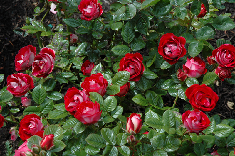 This beautiful and hardy variety produces striking scarlet red blooms with white centers and reverses; quite impressive as an accent or massed; all roses need full sun and well-drained soil