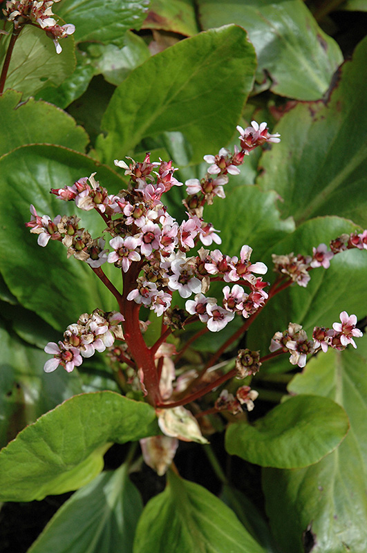 Silberlicht Bergenia features unusual spikes of white flowers with hot pink eyes rising above the foliage in mid spring. Its attractive large succulent oval leaves are green in colour. As an added bonus, the foliage turns a gorgeous dark red in the fall. The dark red stems can be quite attractive.