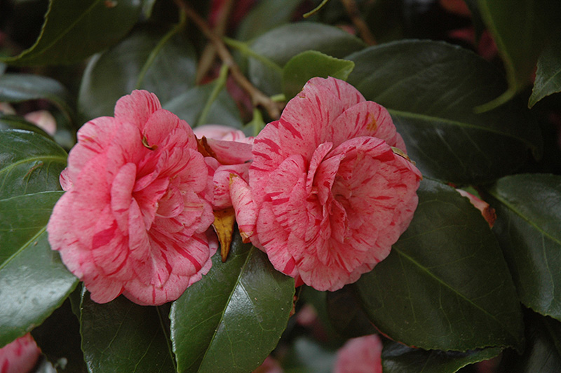 Lustrous evergreen foliage cover this upright shrub; masses of lovely shell pink flowers with deep pink stripes bloom in late winter; provide rich, acidic, moist, well-drained soil
