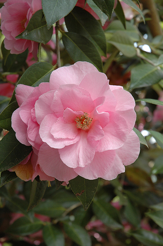 Brigadoon Camellia features showy semi-double pink round flowers with buttery yellow eyes at the ends of the branches from late winter to mid spring. It has dark green evergreen foliage. The glossy pointy leaves remain dark green throughout the winter.