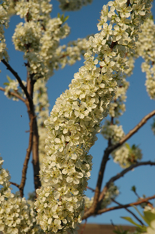 Grenville Plum is clothed in stunning clusters of fragrant white flowers along the branches in early spring before the leaves. It has forest green deciduous foliage. The pointy leaves turn yellow in fall. The fruits are showy red drupes with orange overtones, which are carried in abundance in late summer. The fruit can be messy if allowed to drop on the lawn or walkways, and may require occasional clean-up. The smooth gray bark adds an interesting dimension to the landscape.
