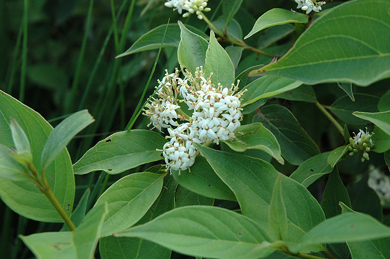 Green Carpet Gray Dogwood has clusters of creamy white flowers at the ends of the branches in late spring. It has green deciduous foliage. The pointy leaves turn an outstanding deep purple in the fall. It produces white berries in late summer.