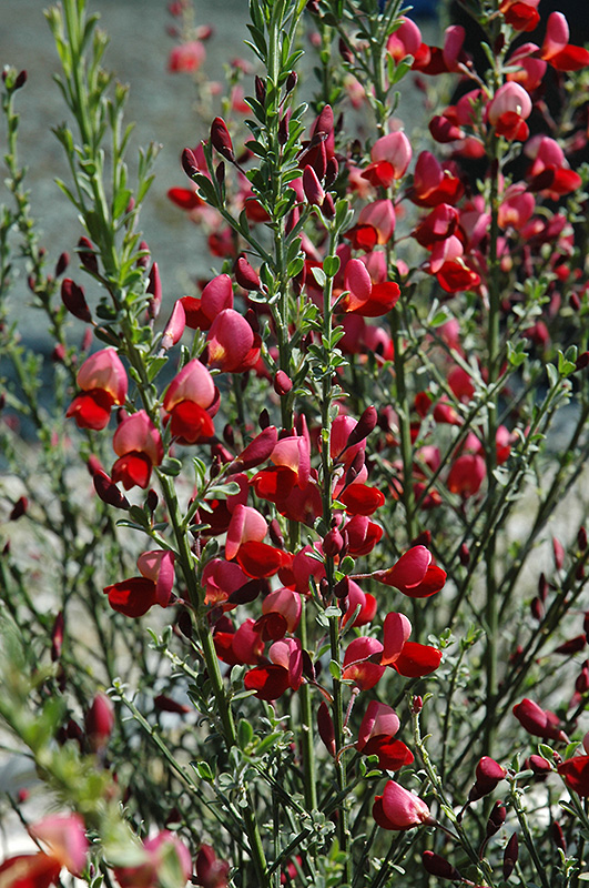 Carla Broom is blanketed in stunning red pea-like flowers with pink overtones and gold centers along the branches from mid spring to early summer. It has emerald green deciduous foliage. The grassy leaves do not develop any appreciable fall colour. The smooth bark and lime green branches add an interesting dimension to the landscape.