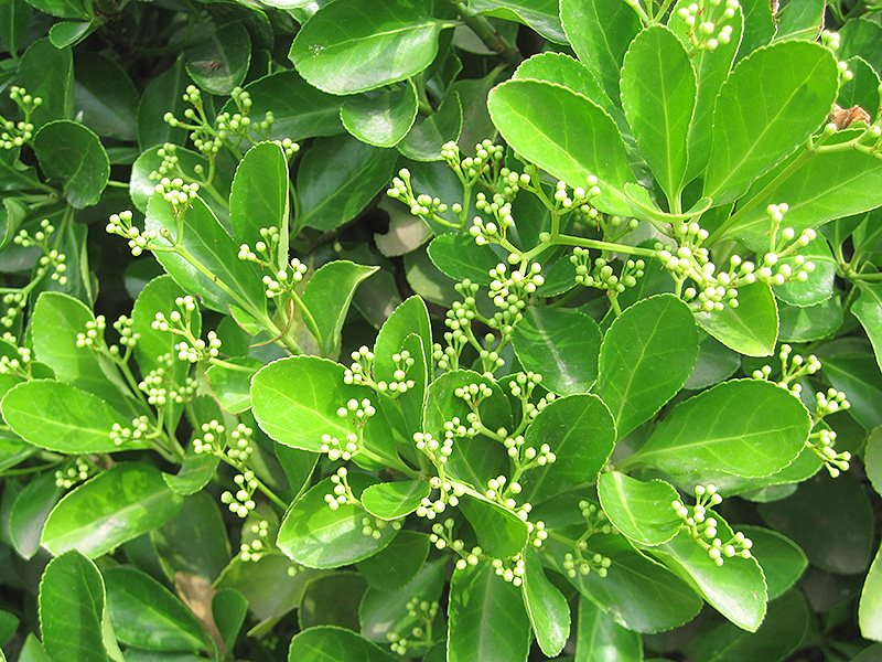 Japanese Euonymus features showy clusters of lightly-scented white star-shaped flowers at the ends of the branches in mid summer. It has attractive dark green evergreen foliage. The glossy oval leaves are highly ornamental and remain dark green throughout the winter. It produces pink capsules in mid fall.