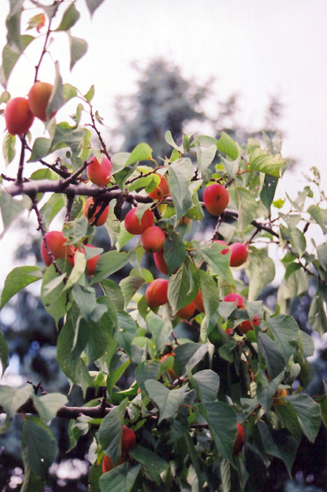 A very hardy plum tree featuring white flowers in early spring followed by tart, bright red fruit in summer, good for jam; glossy black bark, compact and upright in habit, quite ornamental; needs full sun and well-drained soil, a good pollinator for plums