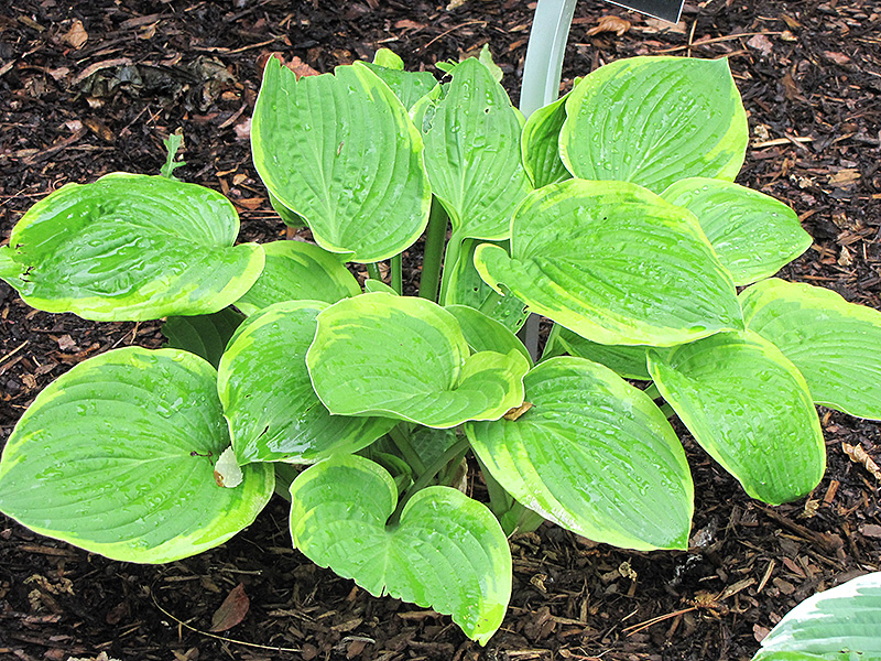 An attractive variety that has large mid-green leaves with a sunny yellow margin; provides beautiful texture and contrast to other plants; pure white spikes of flowers on tall scapes in mid-summer