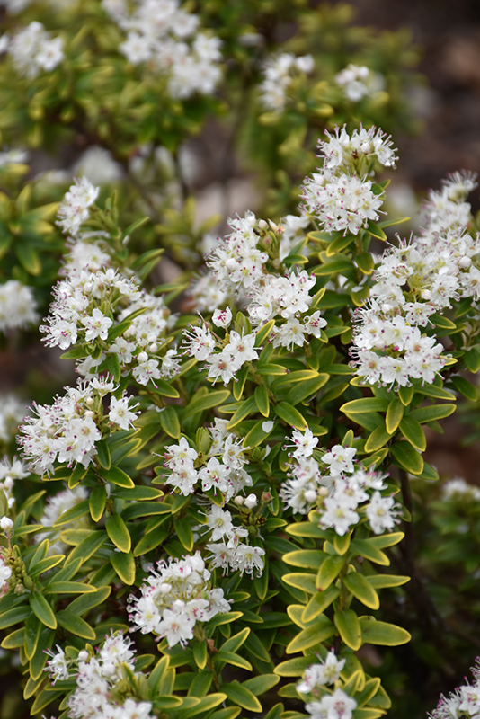 Sand Myrtle features showy clusters of white cup-shaped flowers with red eyes at the ends of the branches from mid spring to early summer, which emerge from distinctive pink flower buds. It has attractive dark green evergreen foliage. The glossy oval leaves are highly ornamental and remain dark green throughout the winter.