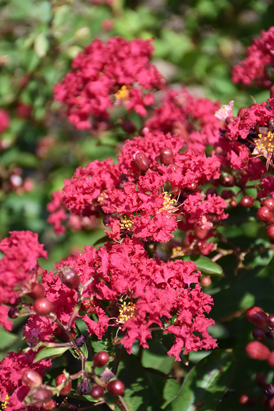 This beautiful and delicate looking dwarf crapemyrtle produces volumes of deep red frilly blooms; a captivating focal point for the garden or border; also good for container planting