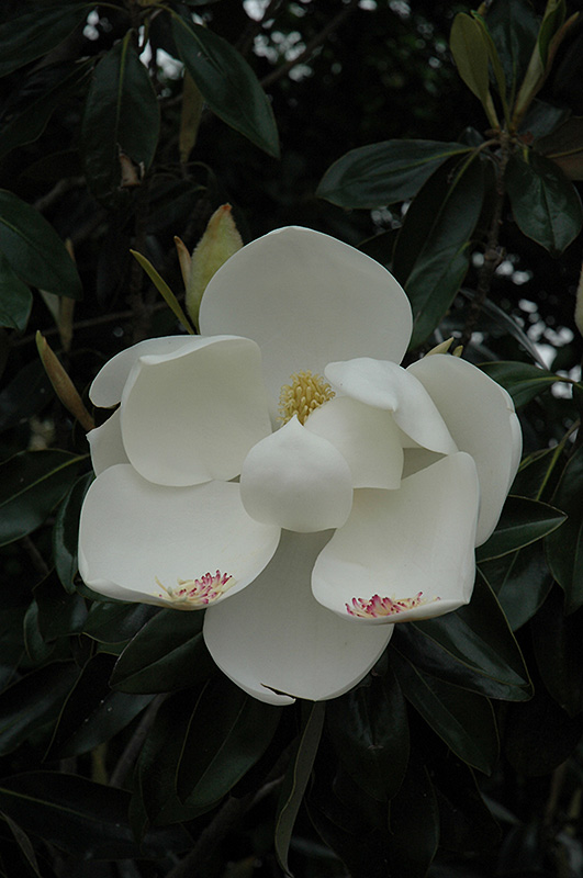 A beautiful flowering accent tree for smaller home landscapes, smothered in showy and fragrant white cup-shaped flowers in spring through summer; large glossy leaves with reddish-brown undersides and a neat pyramidal habit of growth