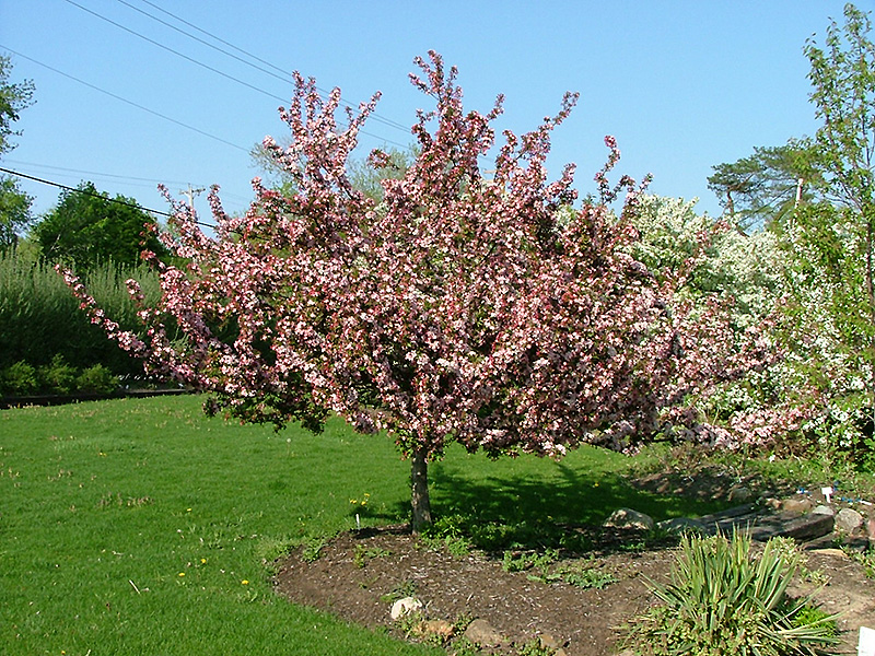 A beautiful cultivar with an upward and wide habit, covered in lovely light pink blooms in spring; fruit is bright red, small and persistent and adds ornamental value for fall and winter; excellent disease resistance