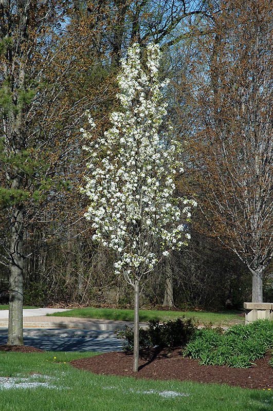 A narrowly upright specimen tree that's covered in attractive white flowers in spring followed by small inedible fruit, good fall color, distinctive symmetrical form is excellent for skyline articulation; can be susceptible to fireblight