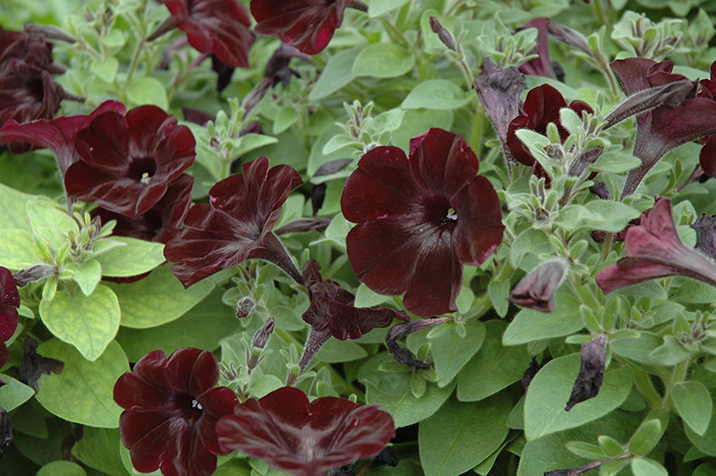 Black Satin Petunia is clothed in stunning black trumpet-shaped flowers at the ends of the stems from late spring to mid fall. Its pointy leaves remain green in colour throughout the season.