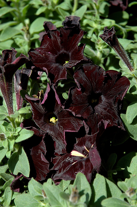 Black Velvet Petunia is bathed in stunning black trumpet-shaped flowers at the ends of the stems from mid spring to mid fall. Its pointy leaves remain green in colour throughout the season.