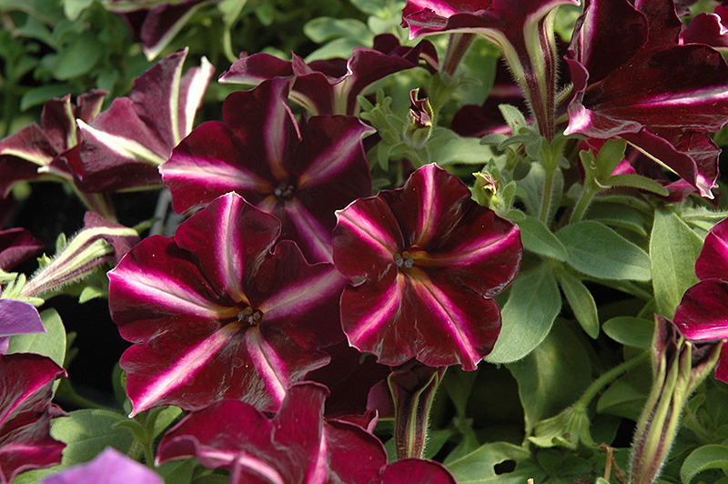 Pinstripe Petunia is draped in stunning deep purple trumpet-shaped flowers with creamy white stripes at the ends of the stems from mid spring to mid fall. Its pointy leaves remain green in colour throughout the season.