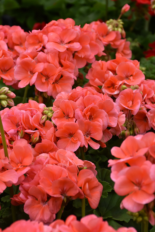 Patriot Evening Glow Geranium features bold balls of lightly-scented salmon flowers at the ends of the stems from late spring to early fall. The flowers are excellent for cutting. Its tomentose round palmate leaves remain green in colour with prominent brown stripes throughout the year.