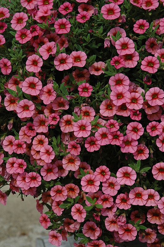 Cabaret® Mango Tango Calibrachoa will grow to be about 10 inches tall at maturity, with a spread of 18 inches. When grown in masses or used as a bedding plant, individual plants should be spaced approximately 12 inches apart. Its foliage tends to remain low and dense right to the ground. This fast-growing annual will normally live for one full growing season, needing replacement the following year.