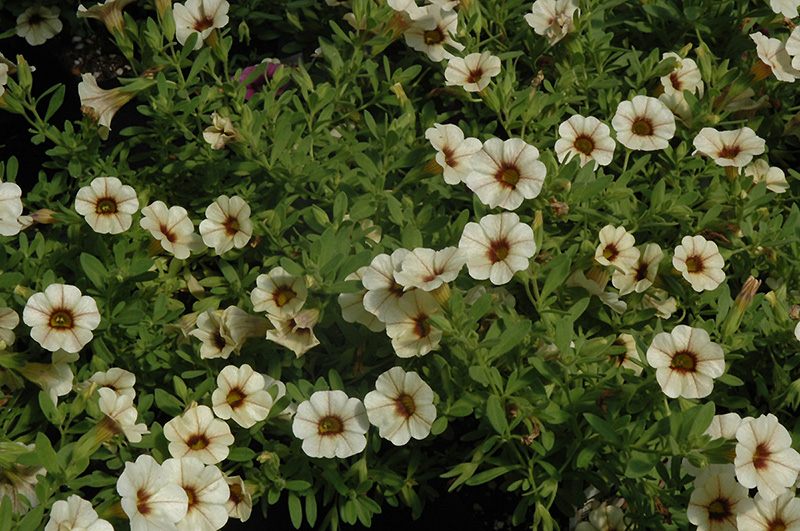 Can-Can® Mocha Calibrachoa is draped in stunning creamy white trumpet-shaped flowers with brown centers at the ends of the stems from late spring to early fall. Its small pointy leaves remain green in colour throughout the season.