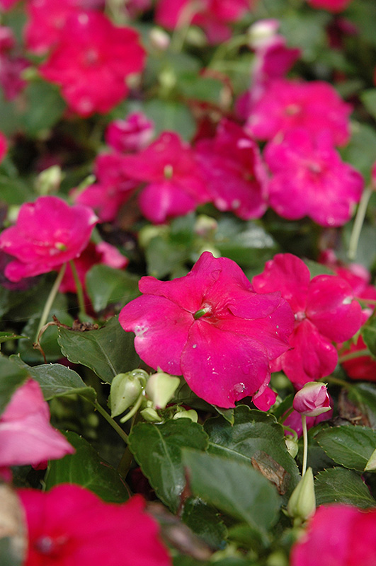 Show Off Burgundy Impatiens is a dense herbaceous annual with a mounded form. Its medium texture blends into the garden, but can always be balanced by a couple of finer or coarser plants for an effective composition.
