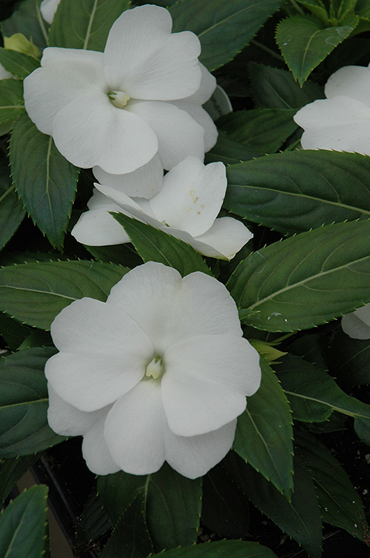 Celebrette Frost New Guinea Impatiens features bold white round flowers at the ends of the stems from mid spring to early fall. Its pointy leaves remain dark green in colour throughout the season.