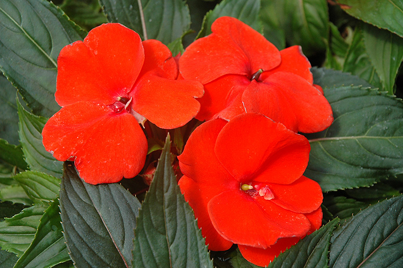 Magnum Fire New Guinea Impatiens features bold scarlet round flowers at the ends of the stems from mid spring to early fall. Its pointy leaves remain dark green in colour throughout the season.
