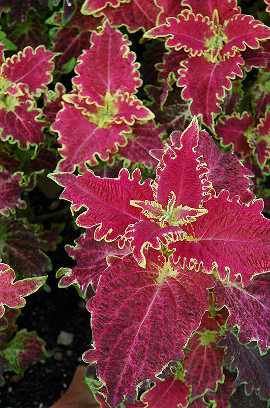 Tiger Lily Coleus' attractive crinkled lobed leaves emerge lime green in spring, turning crimson in colour with distinctive lime green edges the rest of the year on a plant with an upright spreading habit of growth.