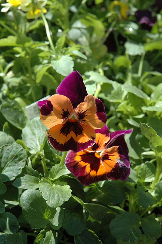 Joker Poker Face Pansy has masses of beautiful deep purple flowers with black eyes and a orange ring at the ends of the stems from early spring to late fall, which are most effective when planted in groupings. Its crinkled round leaves remain green in colour throughout the season.