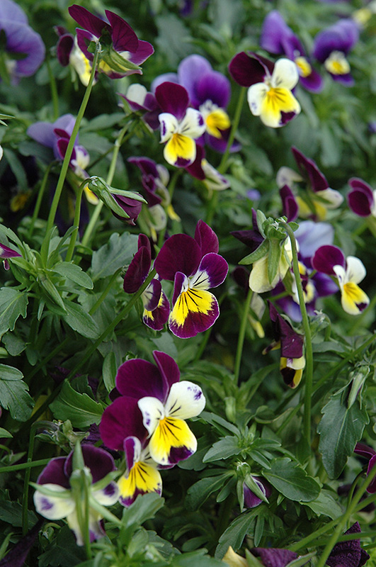 Helen Mount Pansy has masses of beautiful purple flowers with indigo overtones, yellow eyes and blue centers at the ends of the stems from early spring to late fall, which are most effective when planted in groupings. Its small crinkled round leaves remain green in colour throughout the season.