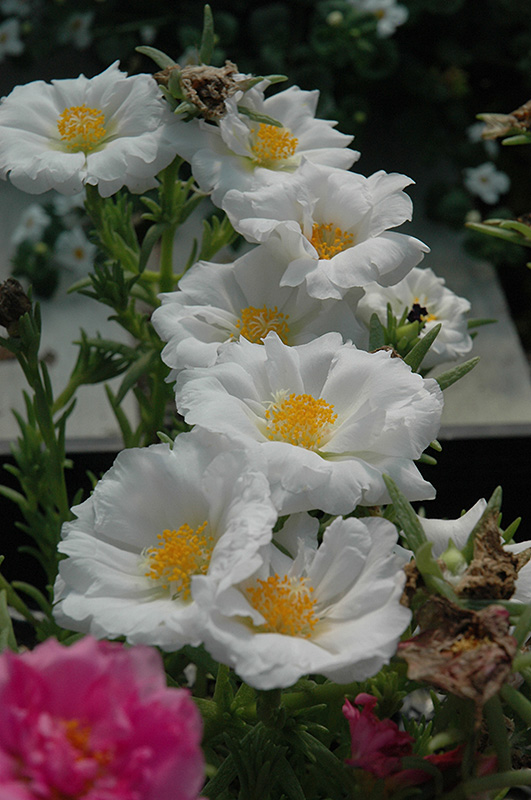 Tequila White Portulaca features showy semi-double white frilly flowers with yellow eyes at the ends of the stems from early summer to early fall. Its tiny succulent needle-like leaves remain green in colour throughout the season.