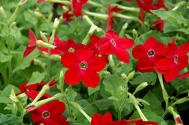 Saratoga™ Deep Rose Flowering Tobacco features showy fragrant cherry red star-shaped flowers at the ends of the stems from early summer to mid fall. Its pointy leaves remain green in colour throughout the season.