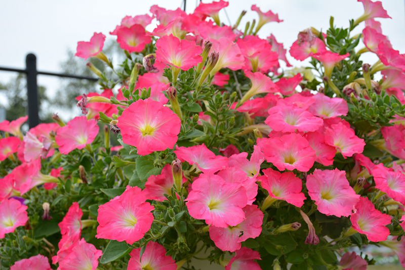 Easy Wave® Rosy Dawn Petunia is smothered in stunning rose trumpet-shaped flowers with yellow throats and white centers at the ends of the stems from mid spring to late summer. Its pointy leaves remain green in colour throughout the season.