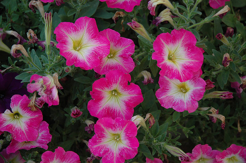 Fame Dark Pink Morn Petunia is smothered in stunning rose trumpet-shaped flowers with yellow throats and white veins at the ends of the stems from mid spring to mid fall. Its pointy leaves remain green in colour throughout the season.