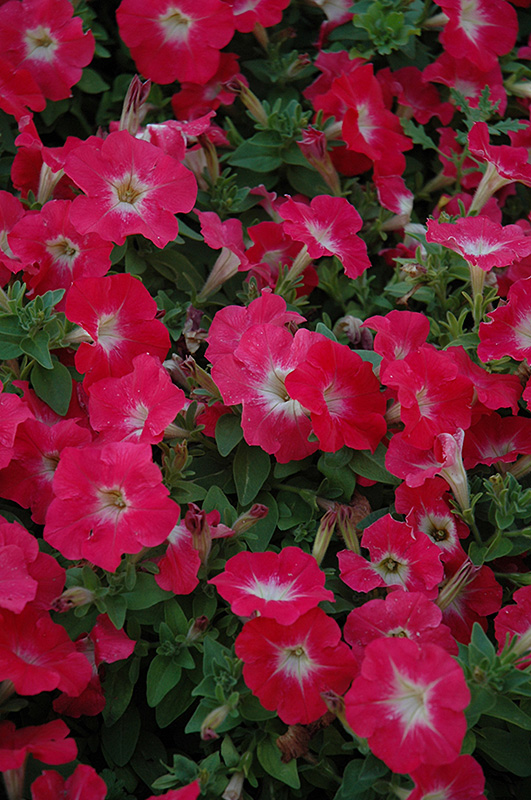 Mambo Red Morn Petunia is smothered in stunning red trumpet-shaped flowers with white centers at the ends of the stems from mid spring to mid fall. Its pointy leaves remain green in colour throughout the season.