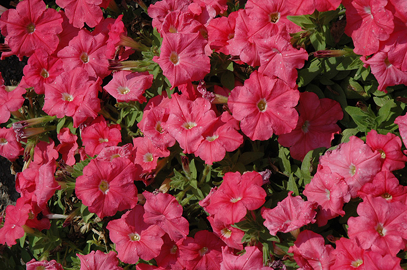 Pretty Flora Coral Petunia is blanketed in stunning coral-pink trumpet-shaped flowers at the ends of the stems from mid spring to mid fall. Its pointy leaves remain green in colour throughout the season.