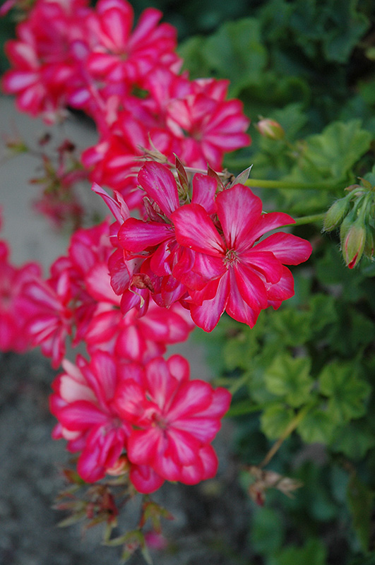 Royal Candy Pink Ivy Leaf Geranium features bold clusters of lightly-scented semi-double pink flowers with white streaks at the ends of the stems from late spring to early fall. The flowers are excellent for cutting. Its serrated pointy palmate leaves remain green in colour throughout the year.