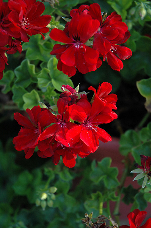 Royal Dark Red Ivy Leaf Geranium features bold clusters of lightly-scented semi-double crimson flowers at the ends of the stems from late spring to early fall. The flowers are excellent for cutting. Its serrated pointy palmate leaves remain green in colour throughout the year.