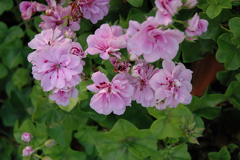 Royal Lavender Ivy Leaf Geranium features bold clusters of lightly-scented semi-double lavender flowers at the ends of the stems from late spring to early fall. The flowers are excellent for cutting. Its serrated pointy palmate leaves remain green in colour throughout the year.