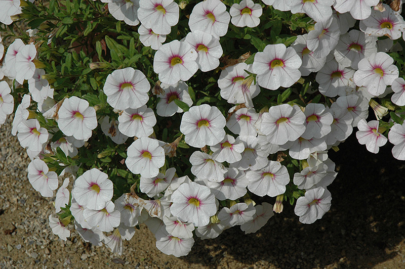 Noa® Almond Blossom Calibrachoa is smothered in stunning white trumpet-shaped flowers with pink centers at the ends of the stems from late spring to early fall. Its small pointy leaves remain green in colour throughout the season.