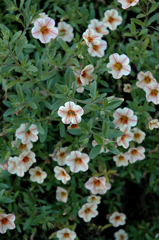Noa® Amber Star Calibrachoa is draped in stunning white trumpet-shaped flowers with crimson throats and crimson stripes at the ends of the stems from late spring to early fall. Its small pointy leaves remain green in colour throughout the season.